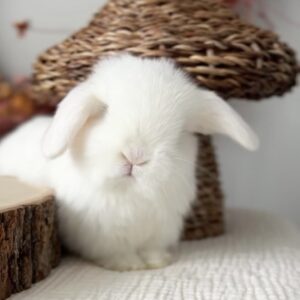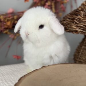 Luna is the epitome of gentle beauty, featuring a dense, pristine white coat that is exceptionally soft to the touch. With her compact, sturdy Holland Lop conformation and her endearing, partially-flopped ears, she looks like a little marshmallow. Her dark eyes provide a stunning contrast to her snowy appearance, giving her a soulful and captivating gaze.